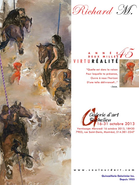 Du 16 au 21 octobre, Solo de l’artiste, Année deux mille 45 – Virturéalité, Galerie Richelieu, 7903 rue St-Denis à Montréal, Vernissage le mercredi, 16 octobre 2013 à 18h30