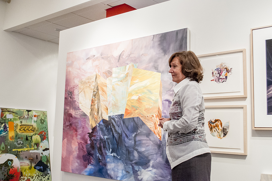 Mme Nicole Brière devant des œuvres de Mélanie Authier, représentée par la Galerie Michel Guimont. Sur le mur du fond, à gauche, un aperçu d’un tableau de Dan Brault. Crédit photo: Isabelle Houde Photographe