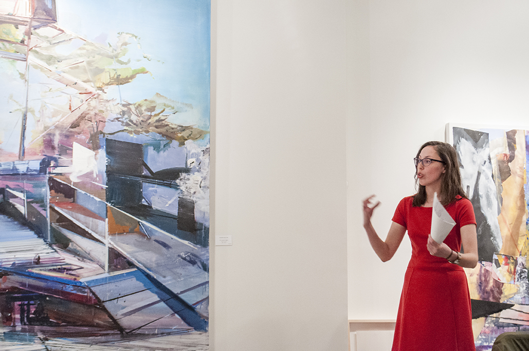 Mme Andréanne Lesage, historienne de l’art, partage son analyse d’une œuvre de Paryse Martin avec les participants.  Crédit photo:  Isabelle Houde Photographe