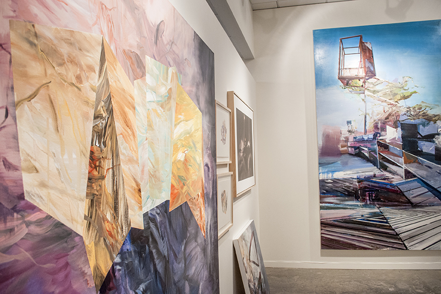 En avant-plan, à gauche, un aperçu d'une oeuvre de Mélanie Authier.  Au fond, un tableau de Martin Golland.  Les deux artistes sont représentés par la Galerie Michel Guimont.  Crédit photo:  Isabelle Houde Photographe