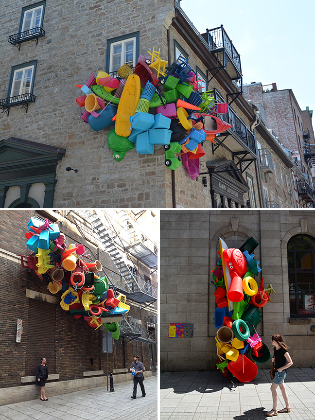 It was at the invitation from Vincent Roy, artistic director of EXMURO, that the sculptor created a body of four works entitled Stock en transit. The event website mentions; “With a pinch of irony, Stock en transit (Stock in transit) playfully brings together an impressive number of colourful objects from our familiar surroundings. These polymorphous sculptures question the elusiveness of things as well as our tendency towards excessive consumption and hoarding of diverse objects, especially during the summertime”.