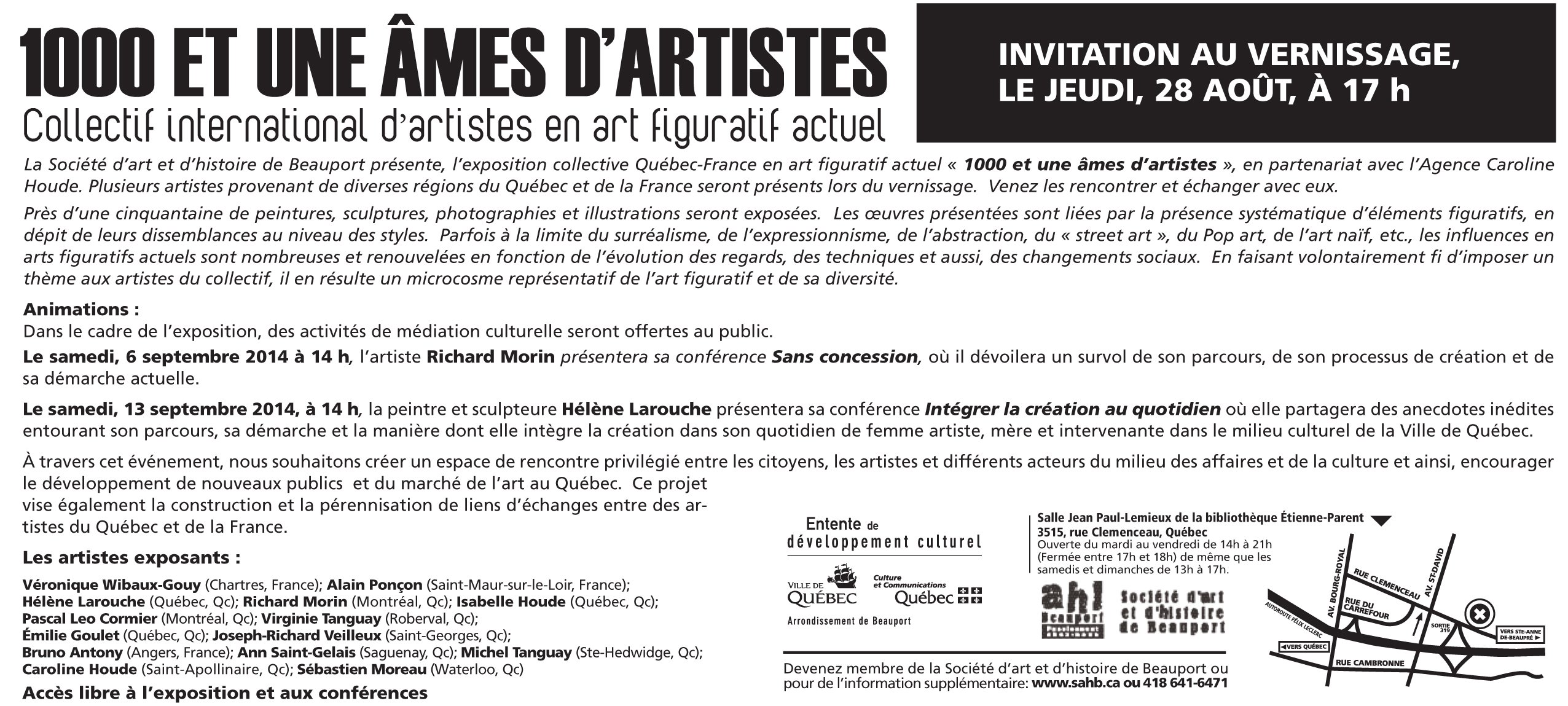 La Société d’art et d’histoire de Beauport présente, du 24 août au 21 septembre 2014, l’exposition collective Québec-France en art figuratif « 1000 et une âmes d’artistes », en partenariat avec l’Agence Caroline Houde. L’exposition aura lieu à la Salle Jean Paul-Lemieux de Québec (arrondissement de Beauport), située au 3515, rue Clemenceau. Le vernissage se tiendra le jeudi, 28 août 2014, à 17h. Plusieurs artistes provenant de diverses régions du Québec et de la France seront présents lors du vernissage. Venez les rencontrer et échanger avec eux.