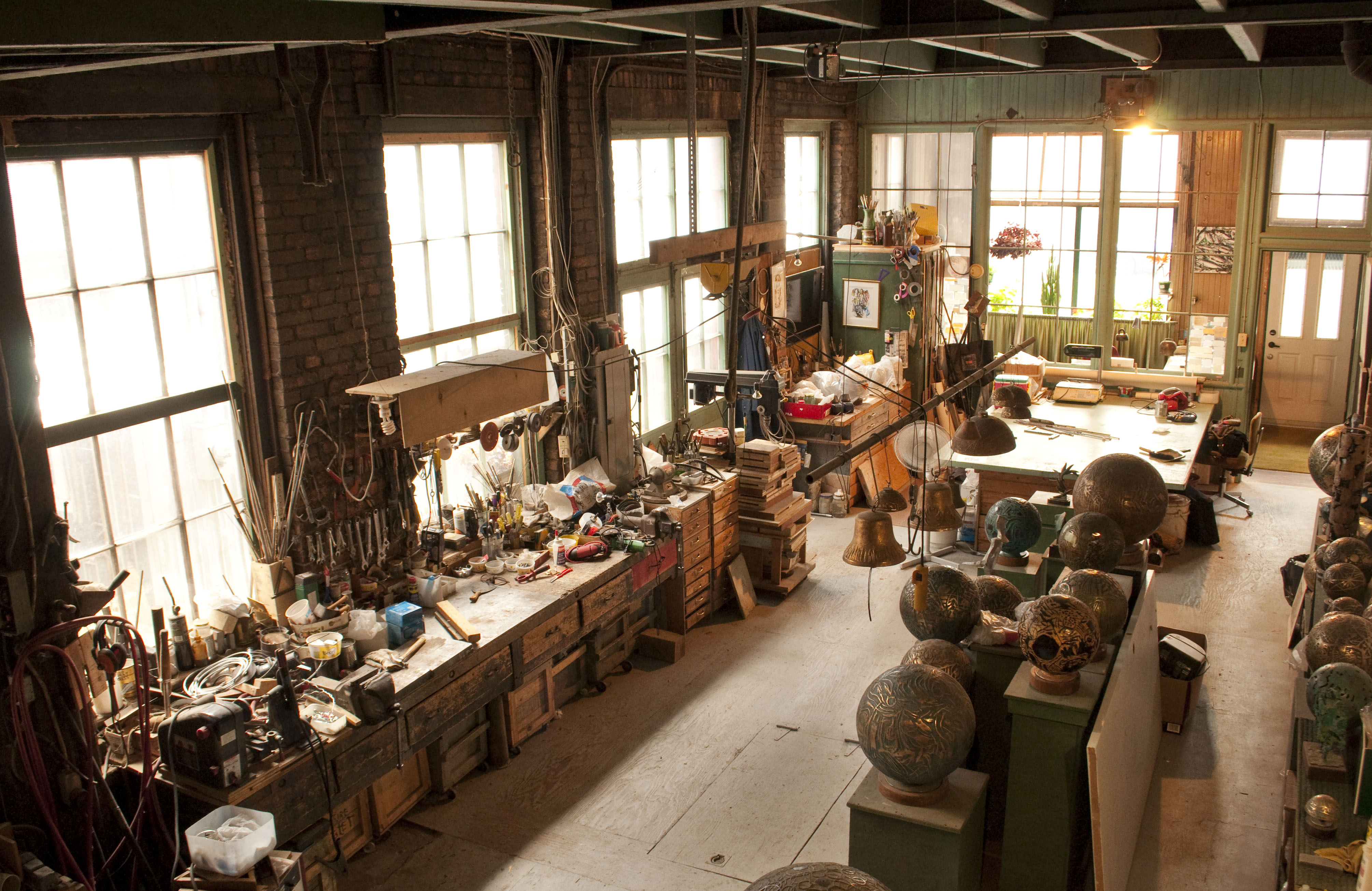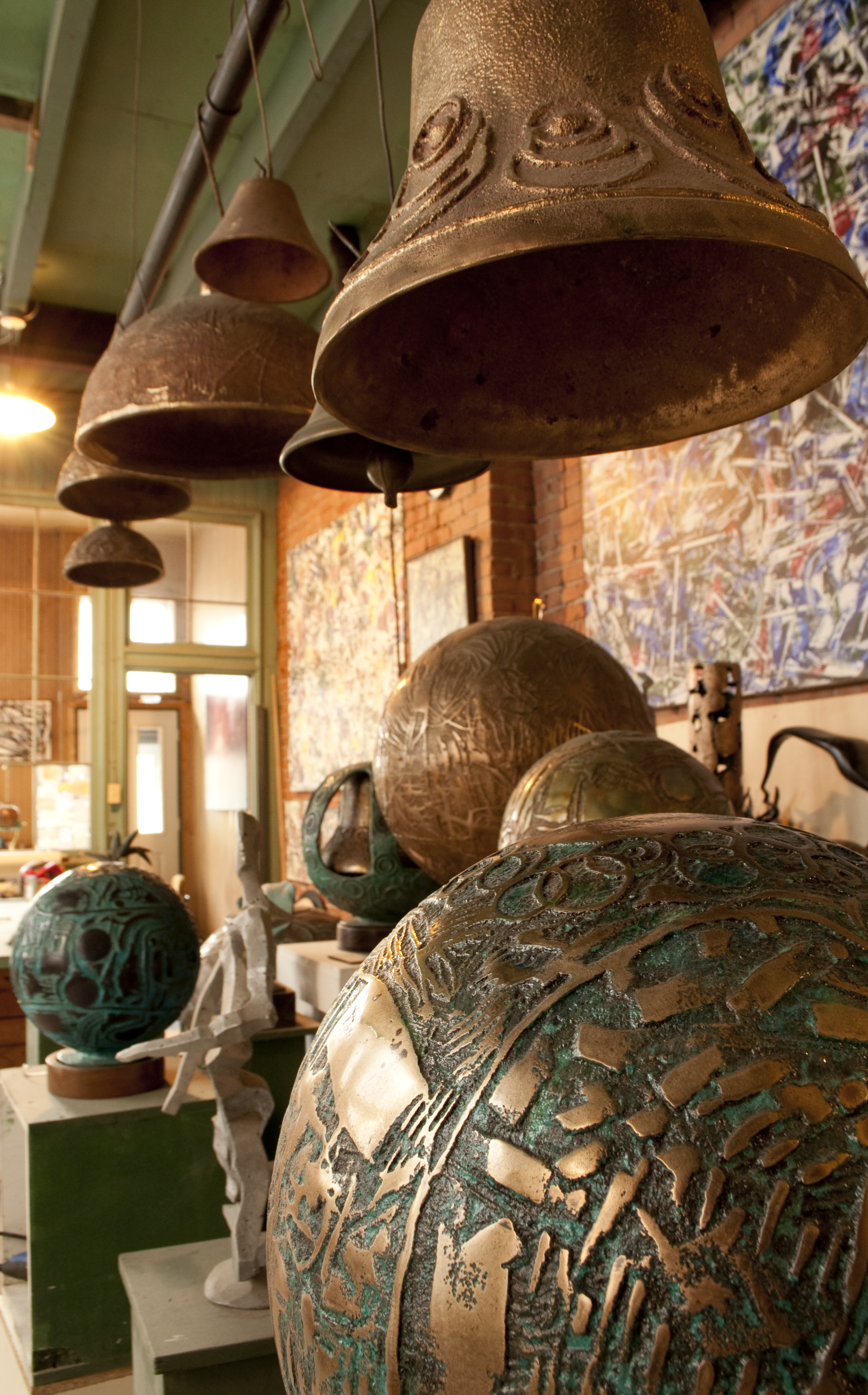 À l’intérieur, il fait soleil. De grands tableaux abstraits habillent les vieux murs de brique de la fonderie. D’intrigantes sphères de bronze sculptées par l’artiste, arborent des reliefs variés dont plusieurs évoquent des éléments organiques. De magnifiques cloches, toujours en bronze, sont suspendues au centre de la pièce du rez-de-chaussée, tandis que la riche fenestration des lieux jette une lumière mettant parfaitement en valeur les patines et les textures des œuvres de l’artiste. L’ensemble confère à l’atelier chargé d’histoire, une atmosphère qui se rapproche du sacré.