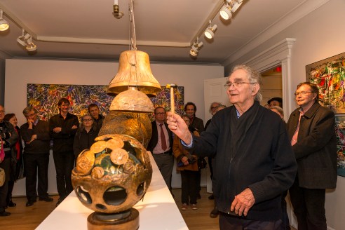 Aristide Gagnon fait une démonstration de la sonorité de ses cloches de bronze lors d’une visite guidée avec le Club des collectionneurs en arts visuels de Québec, le 2 mai 2016. Crédit photo: Isabelle Houde Photographe